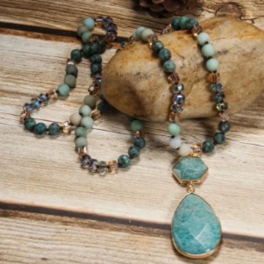 Green faceted teardrop and round accented by gold metal trim stone amulates hang on green and brown natural stone beaded necklace.